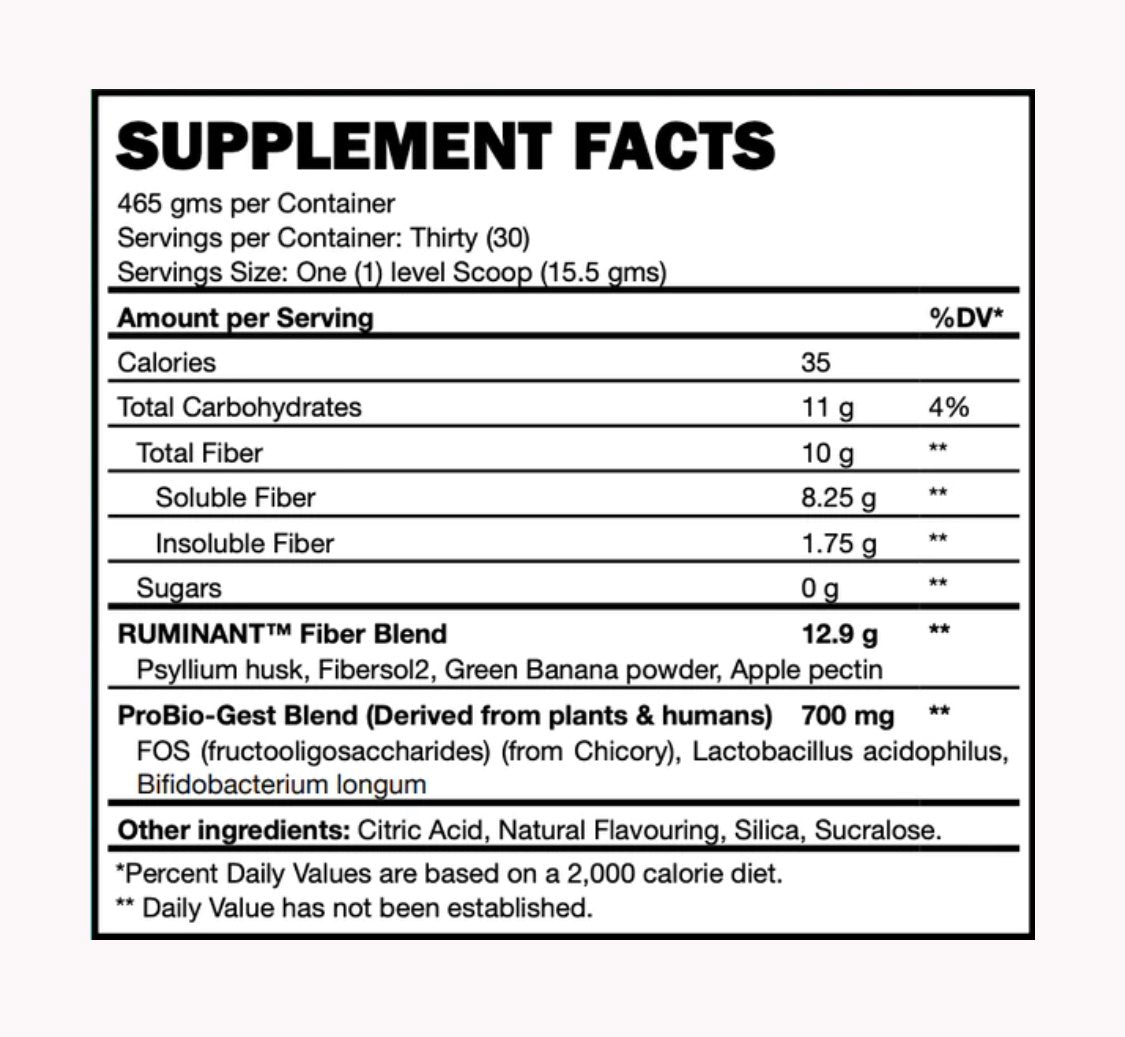 A comprehensive source of soluble and insoluble fiber can be found in our innovative RUMINANT™ Fiber Blend. Comprised of high-quality, natural sources of fiber including Psyllium Husk Powder, Fibersol 2 & Green Banana Powder, Fiber+ allows you to normalise bowel movements, lower blood pressure, improve the balance of “good to bad” cholesterol, and stabilise blood sugar levels.