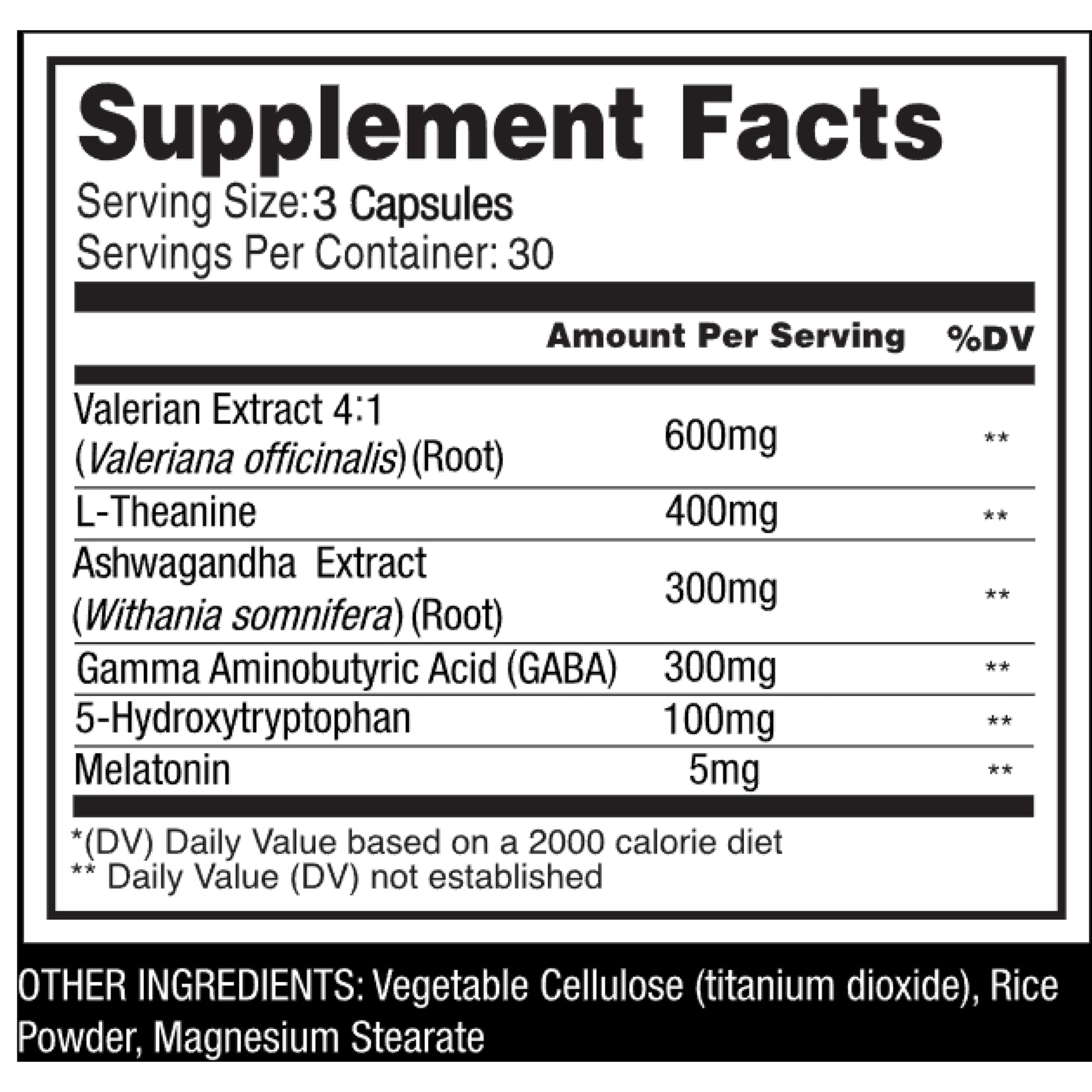 SLEEP combines Valerian Root, Ashwagandha, GABA, 5-HTP, and L-Theanine, each renowned for their sleep-promoting properties. This blend works synergistically to support relaxation and promote a healthy sleep cycle, enabling faster sleep onset and deeper, more restorative sleep.