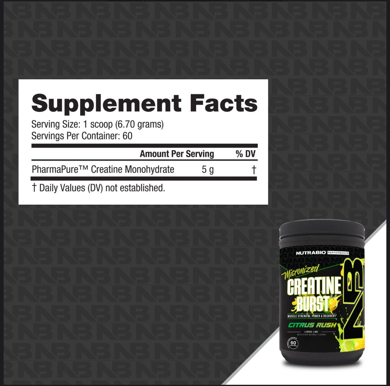 Each scoop of NutraBio Creatine Burst allows the flavorful micronized creatine monohydrate to fuel your muscles efficiently, helping you push your body to the max during brutal training sessions.
